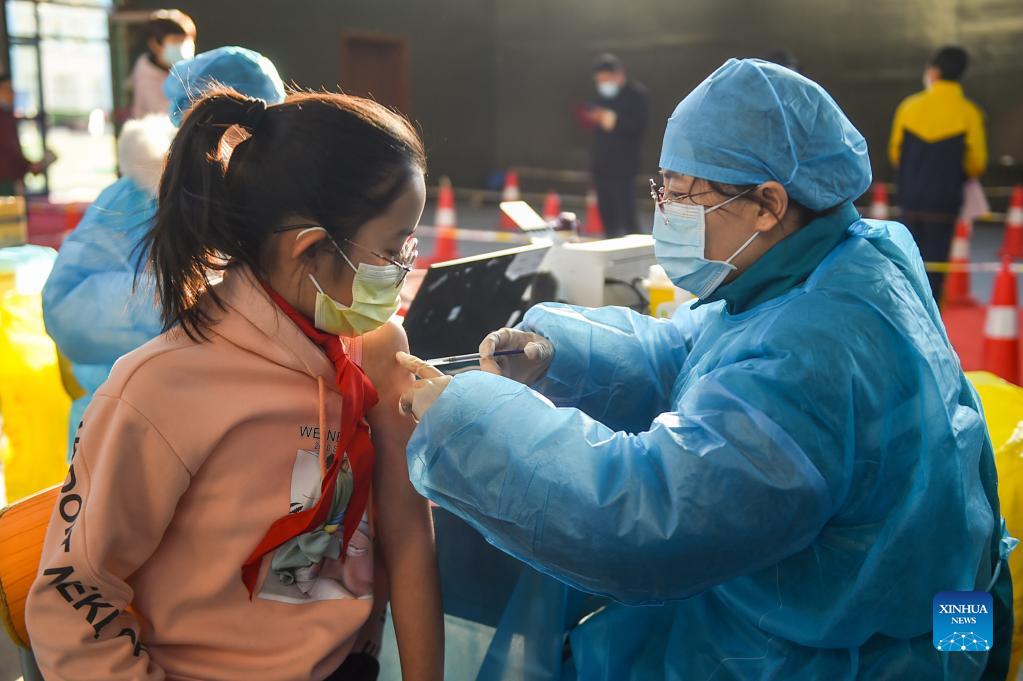 A kid receives a dose of COVID-19 vaccine at a school in Hohhot, north China's Inner Mongolia Autonomous Region, Nov. 23, 2021. Hohhot recently launched a COVID-19 vaccination campaign for children aged 3 to 11. (Xinhua/Peng Yuan)