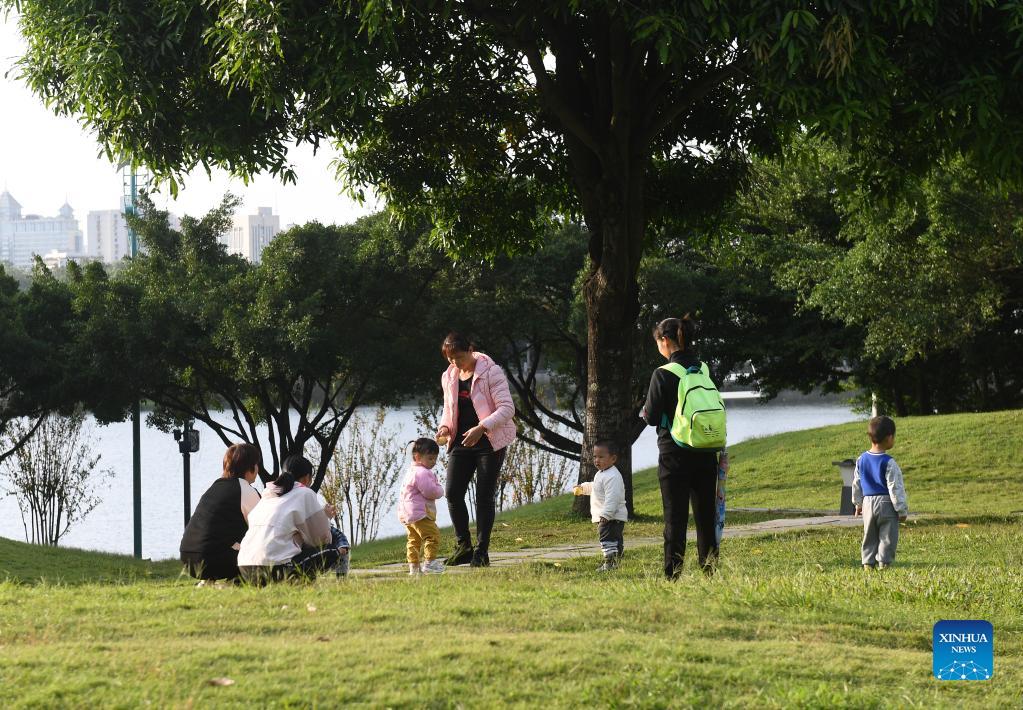 People relax near the Nanhu Lake in Nanning, south China's Guangxi Zhuang Autonomous Region, Nov. 23, 2021. (Xinhua/Lu Boan)