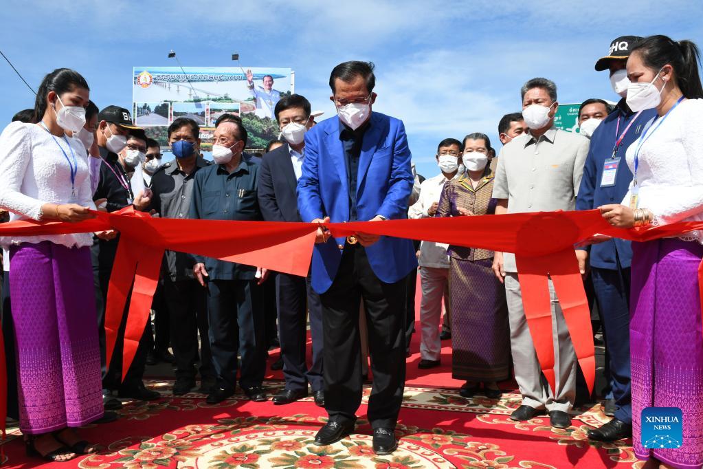 Cambodian Prime Minister Samdech Techo Hun Sen cuts the ribbon to inaugurate the eighth Cambodia-China Friendship Bridge in Stueng Trang district of Cambodia, Nov. 23, 2021. Spanning across the Mekong River and connecting Kampong Cham and Tboung Khmum provinces in southeastern Cambodia, the eighth Chinese-built friendship bridge has brought hope of development and ease of doing businesses to residents in both provinces. (Photo by Ly Lay/Xinhua)