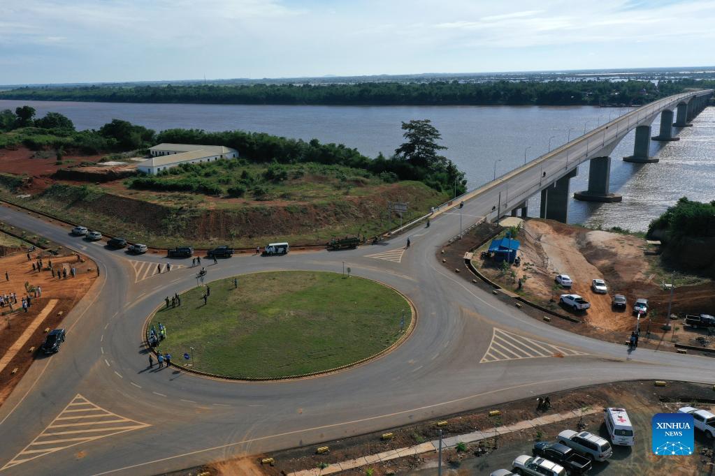 Aerial photo taken on Nov. 12, 2021 shows the eighth Cambodia-China Friendship Bridge in Cambodia. Spanning across the Mekong River and connecting Kampong Cham and Tboung Khmum provinces in southeastern Cambodia, the eighth Chinese-built friendship bridge has brought hope of development and ease of doing businesses to residents in both provinces. (Photo by Ly Lay/Xinhua)