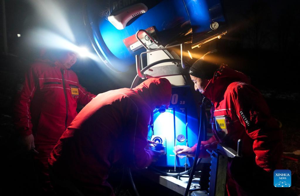 Workers check the snowmaking machine at Changbai Mountain Ski Resort in northeast China's Jilin Province, Nov. 19, 2021. At Changbai Mountains Ski Resort, snow-making professionals as snow cannon operators, groomer drivers and snow track patrols work in cold nights in order to secure high quality of snow for visitors. As the 2022 Beijing Olympics approaches and the Chinese government encourages 300 million people to be involved in winter sports, ski resorts in China are seeing increasing visitors and providing more diversed job opportunities. (Xinhua/Xu Chang)