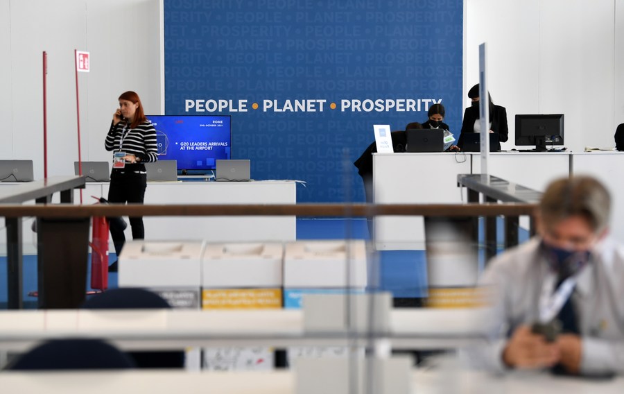 People work at the media center of the G20 Heads of State and Government Summit in Rome, Italy, on Oct. 28, 2021. (Xinhua/Jin Mamengni)