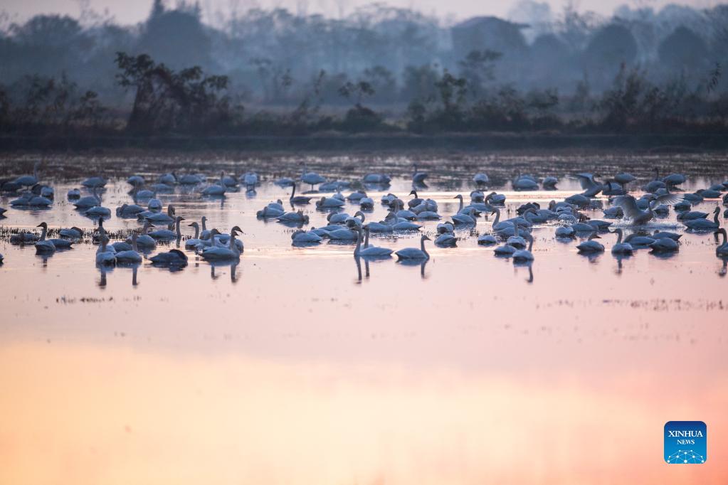 Little swans are seen at the Donggu Lake wetland of the Quyuan administration area in Yueyang City, central China's Hunan Province, Nov. 23, 2021. About 3,000 little swans have arrived at the Donggu Lake wetland of the Quyuan administration area in Yueyang for wintering. (Xinhua/Zhao Zhongzhi)