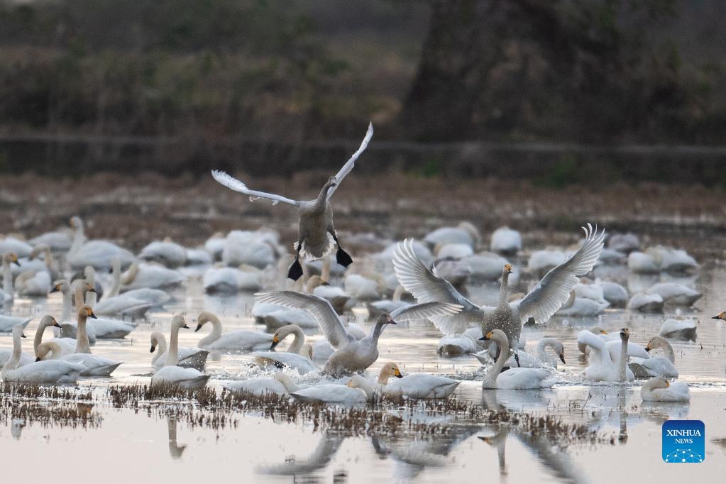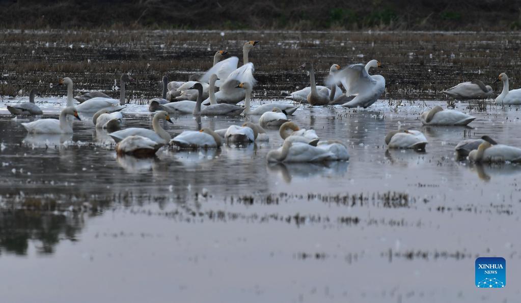 Little swans are seen at the Donggu Lake wetland of the Quyuan administration area in Yueyang City, central China's Hunan Province, Nov. 24, 2021. About 3,000 little swans have arrived at the Donggu Lake wetland of the Quyuan administration area in Yueyang for wintering. (Xinhua/Zhao Zhongzhi)