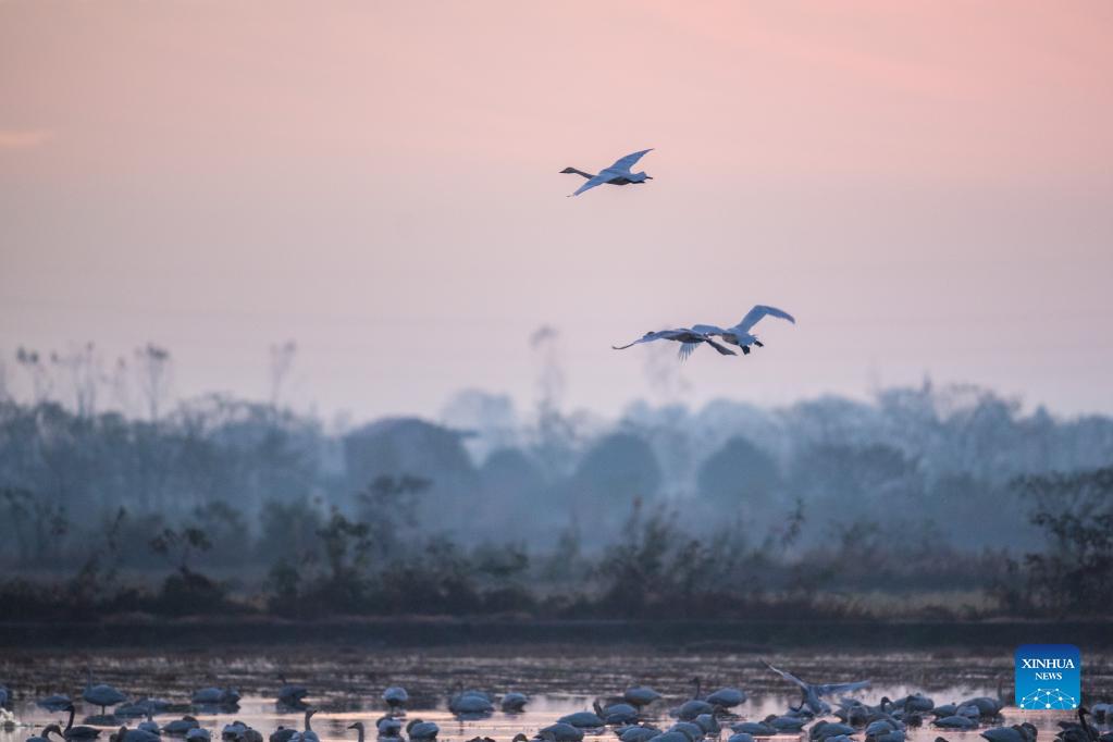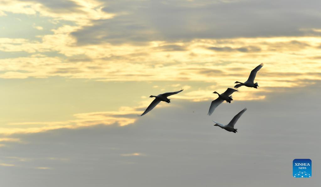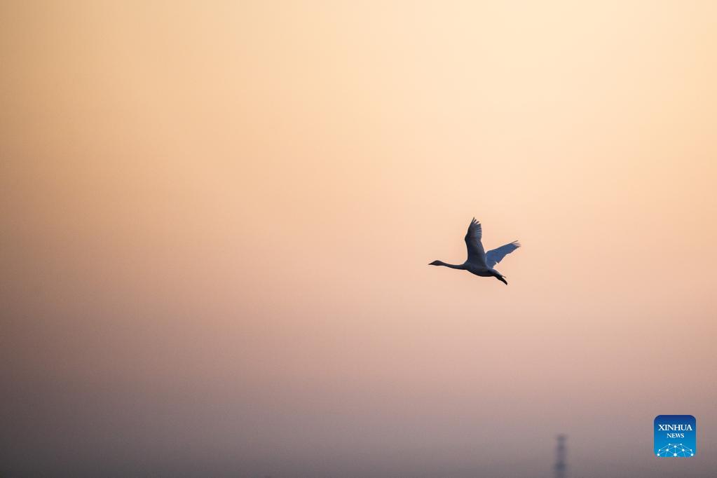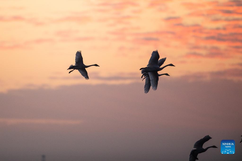 A flock of little swans fly at dawn in the Quyuan administration area in Yueyang City, central China's Hunan Province, Nov. 24, 2021. About 3,000 little swans have arrived at the Donggu Lake wetland of the Quyuan administration area in Yueyang for wintering. (Xinhua/Zhao Zhongzhi)