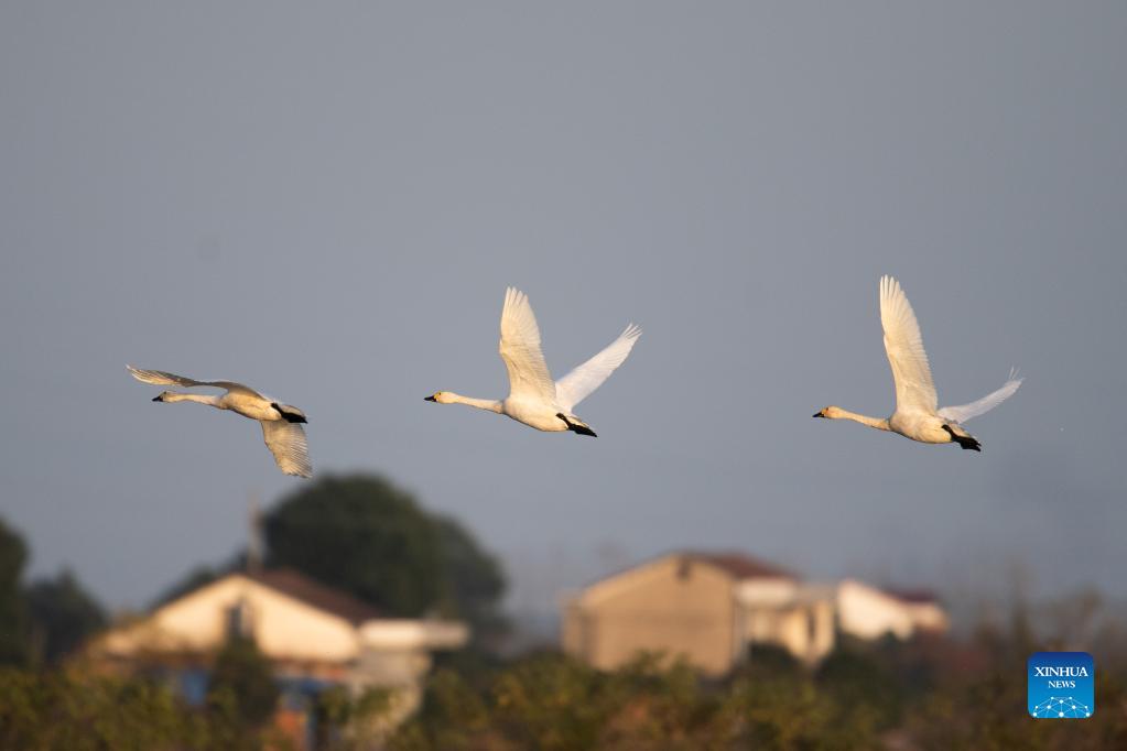 Little swans fly in the sky at the Donggu Lake wetland of the Quyuan administration area in Yueyang City, central China's Hunan Province, Nov. 23, 2021. About 3,000 little swans have arrived at the Donggu Lake wetland of the Quyuan administration area in Yueyang for wintering. (Xinhua/Zhao Zhongzhi)
