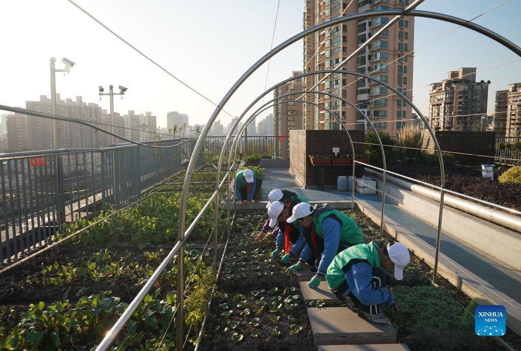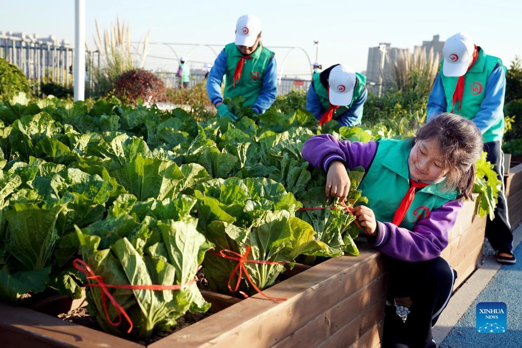 Photo taken on Nov. 24, 2021 shows Jinhua Middle School agronomy group working in their "rooftop eco-garden", as part of an anniversary exhibition of the project. The school, affiliated to East China Normal University in Shanghai, built the "eco-garden" on the rooftop of a 6-storey building a year ago. It has become invaluable for students developing practical agronomy skills during their extra-curricular hours. (Xinhua/Liu Ying)