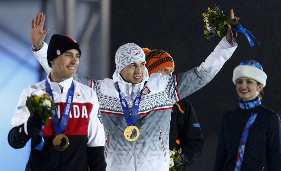 Gold medalist Zbigniew Brodka of Poland (2nd L) waves to the spectators at the medal ceremony for the men's 1500m Speed Skating at the 2014 Sochi Winter Olympic Games in Sochi, Russia, Feb. 16, 2014. (Xinhua/Wang Lili)