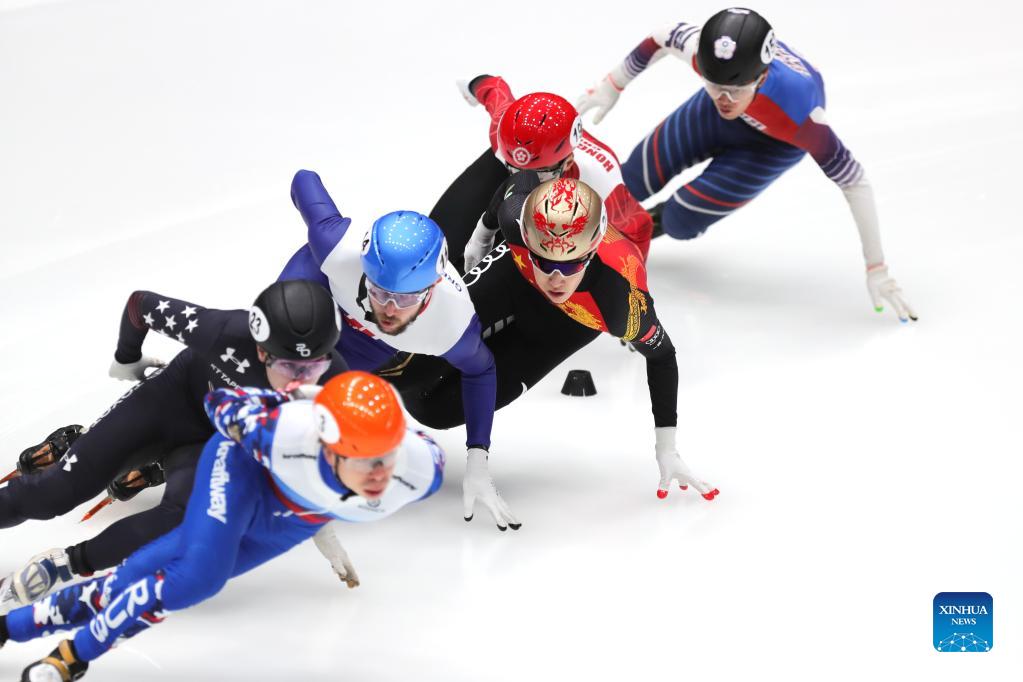 Zhang Tianyi (2nd R) of China competes during the heat of men's 1500m race at the ISU World Cup Short Track Speed Skating series in Dordrecht, the Netherlands, Nov. 25, 2021. (Xinhua/Zheng Huansong)