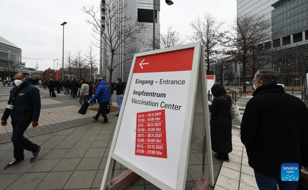 People queue to receive the COVID-19 vaccine outside a vaccination center in Frankfurt, Germany, on Nov. 25, 2021. The total number of COVID-19 deaths in Germany has climbed to 100,119, as 351 fatal cases were recorded within the last 24 hours, the Robert Koch Institute (RKI) announced on Thursday. (Xinhua/Lu Yang)