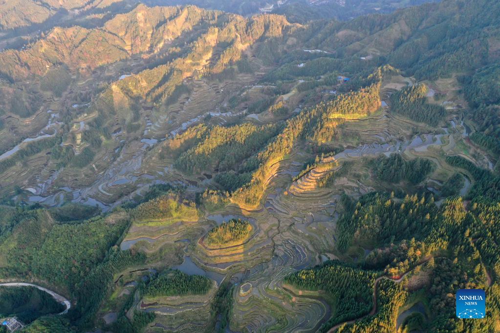 Aerial photo taken on Nov. 25, 2021 shows the winter scenery of Dangjiu Village in Gandong Township of Rongshui Miao Autonomous County, south China's Guangxi Zhuang Autonomous Region. (Xinhua/Huang Xiaobang)