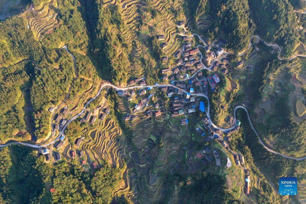 Aerial photo taken on Nov. 25, 2021 shows the winter scenery of Dangjiu Village in Gandong Township of Rongshui Miao Autonomous County, south China's Guangxi Zhuang Autonomous Region. (Xinhua/Huang Xiaobang)