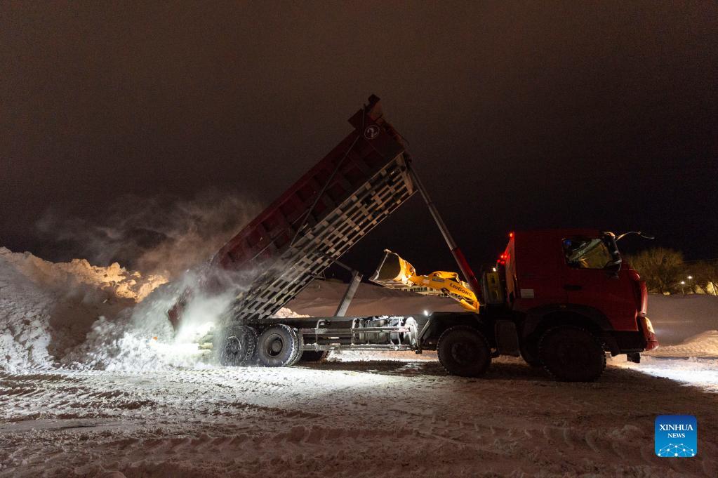 A vehicle unloads snow at a vacant area in Hegang City, northeast China's Heilongjiang Province, Nov. 24, 2021. (Xinhua/Xie Jianfei)