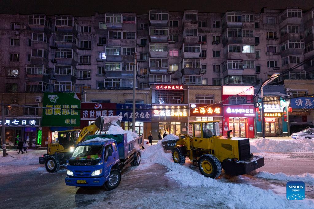 Vehicles clear snow off the road in Hegang City, northeast China's Heilongjiang Province, Nov. 24, 2021. (Xinhua/Xie Jianfei)