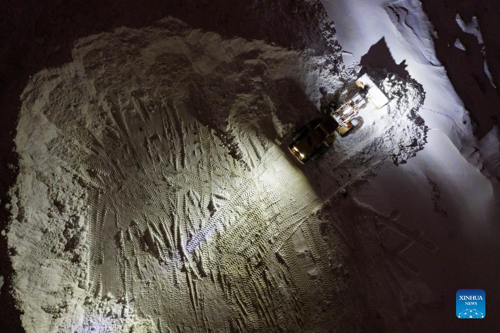 Aerial photo taken on Nov. 24, 2021 shows a vehicle clearing snow in Hegang City, northeast China's Heilongjiang Province. (Xinhua/Xie Jianfei)
