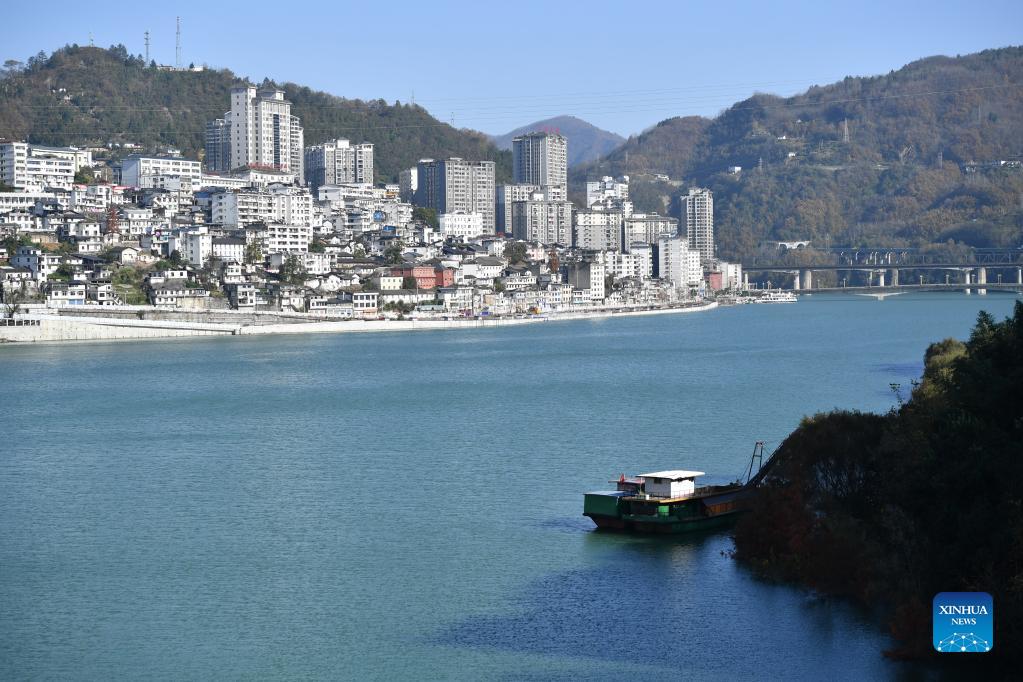 Aerial photo taken on Nov. 23, 2021 shows Ziyang County in Ankang City, northwest China's Shaanxi Province. Famous for its tea plantation, Ziyang County has been in recent years promoting rural tourism in a bid to help increase the incomes of local residents by combining its tourism with tea culture. (Xinhua/Shao Rui)