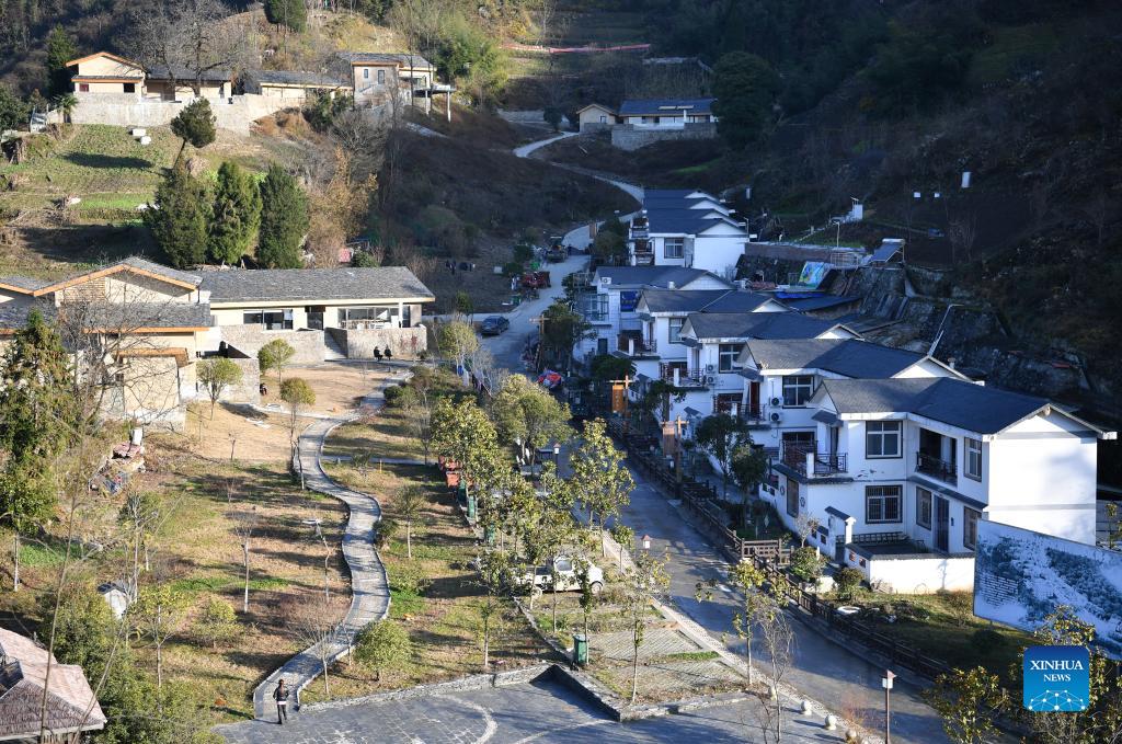 Aerial photo taken on Nov. 24, 2021 shows Qingzhong Village, in Chengguan Township, Ziyang County of Ankang City, northwest China's Shaanxi Province. Famous for its tea plantation, Ziyang County has been in recent years promoting rural tourism in a bid to help increase the incomes of local residents by combining its tourism with tea culture. (Xinhua/Shao Rui)