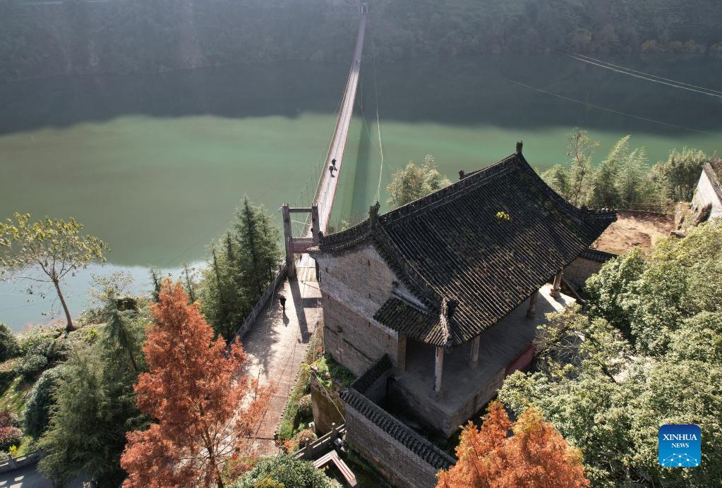 Aerial photo taken on Nov. 24, 2021 shows an architecture in Ziyang County of Ankang City, northwest China's Shaanxi Province. Famous for its tea plantation, Ziyang County has been in recent years promoting rural tourism in a bid to help increase the incomes of local residents by combining its tourism with tea culture. (Xinhua/Shao Rui)