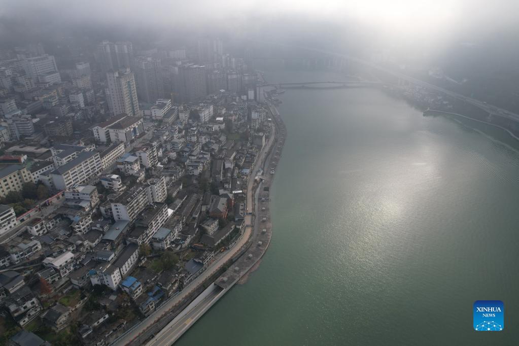 Aerial photo taken on Nov. 25, 2021 shows Ziyang County in Ankang City, northwest China's Shaanxi Province. Famous for its tea plantation, Ziyang County has been in recent years promoting rural tourism in a bid to help increase the incomes of local residents by combining its tourism with tea culture. (Xinhua/Shao Rui)