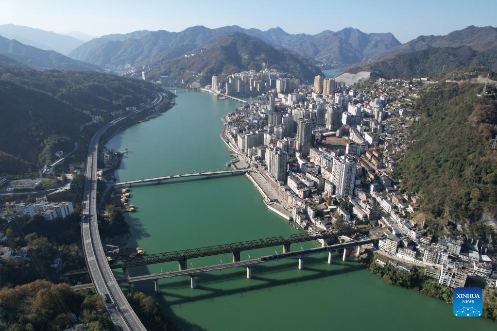 Aerial photo taken on Nov. 23, 2021 shows Ziyang County in Ankang City, northwest China's Shaanxi Province. Famous for its tea plantation, Ziyang County has been in recent years promoting rural tourism in a bid to help increase the incomes of local residents by combining its tourism with tea culture. (Xinhua/Shao Rui)