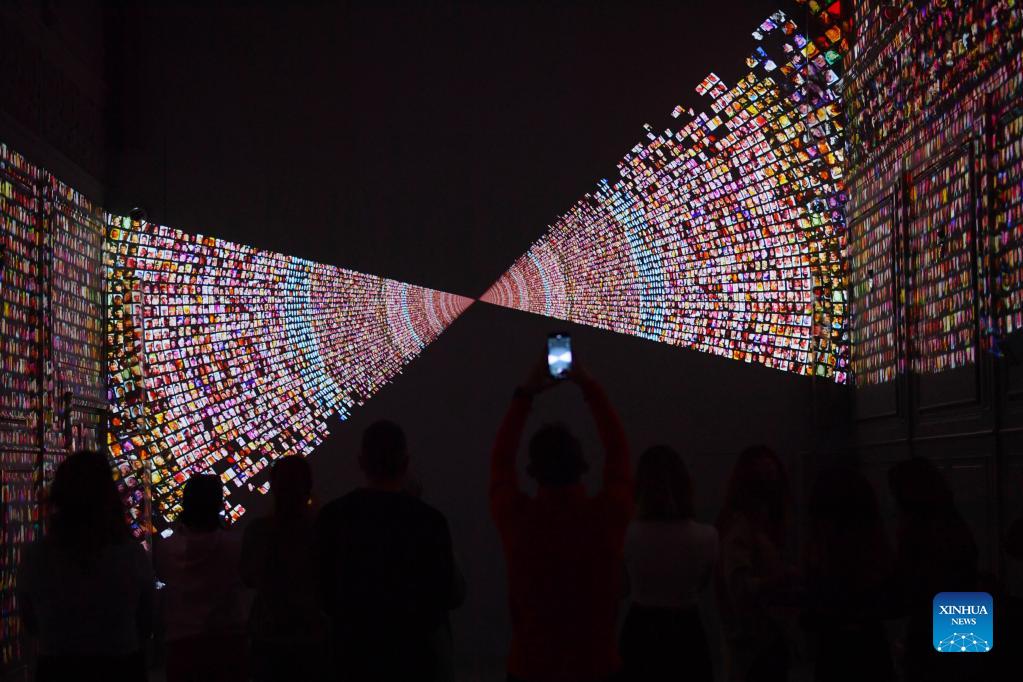 People visit a digital art exhibition at a movie theater in Istanbul, Turkey, on Nov. 24, 2021. A digital art exhibition, created by using artificial intelligence (AI), fascinates art lovers at a newly renovated ancient movie theater in Istanbul. (Xinhua/Sadat)