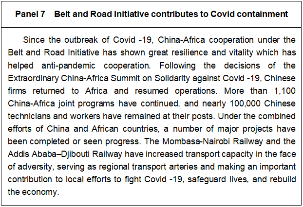 – Combating Covid-19 and building a China-Africa community of health for all. China will continue to provide anti-pandemic assistance to African countries, share its experience in coordinating routine epidemic prevention and control with social and economic development, and speed up cooperation with Africa on vaccines. China-Africa health cooperation is not a short-term measure, but a long-term and far-sighted strategy. It focuses on assisting Africa to improve its public health system and its capacity for controlling and preventing major communicable diseases, so as to promote a China-Africa community of health for all in the new era.