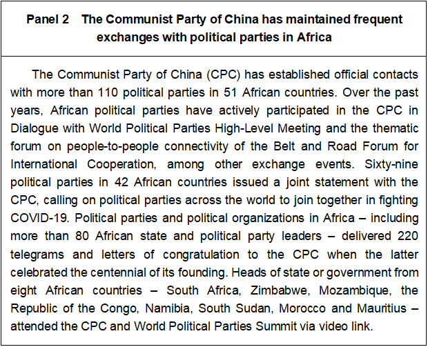 China and African countries conduct close exchanges between political parties, legislative bodies and consultative bodies, building multi-level, multi-channel, multi-form and multi-dimensional friendly cooperation. The Communist Party of China expands exchanges and cooperation with political parties in African countries based on the principles of independence, equality, mutual respect and non-interference in each other’s internal affairs. It is committed to building a new type of relations between political parties in which different political parties seek common ground while setting aside differences, and they respect and learn from each other. The two sides make full use of the positive role of legislation and supervision to provide policy support for bilateral cooperation and exchanges. The National People’s Congress of China has established mechanisms for regular exchanges with parliaments in Egypt, South Africa and Kenya, and bilateral friendship groups with parliaments in 35 African countries. The National Committee of the Chinese People’s Political Consultative Conference (CPPCC) and its subsidiary organs maintain contacts with 59 institutions in 39 African countries. In June 2019, the CPPCC National Committee established the China-Africa Friendship Group, the first of its kind in the history of the CPPCC.