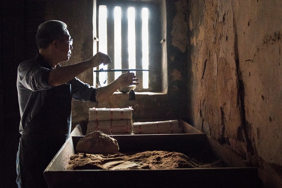 Pu Lianggong weighs incense powder in Yongchun county, Quanzhou city of southeast China’s Fujian Province. (Photo/Zhang Wenqing)