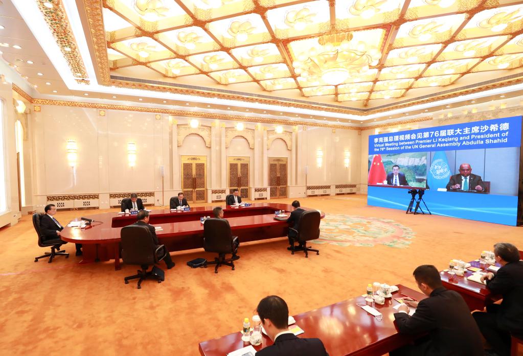 Chinese Premier Li Keqiang meets with Abdulla Shahid, president of the 76th session of the United Nations General Assembly (UNGA), via video link at the Great Hall of the People in Beijing, capital of China, Nov. 26, 2021. (Xinhua/Pang Xinglei)