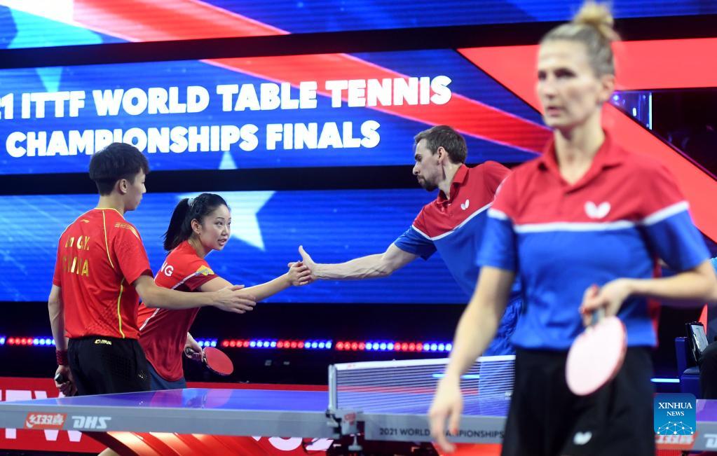 Lin Gaoyuan (1st L) and Lily Zhang (2nd L) greet Kirill Skachkov (2nd R)/Olga Vorobeva after the mixed doubles round of 16 match between Lin Gaoyuan of China/Lily Zhang of the United States and Kirill Skachkov/Olga Vorobeva of RTT at 2021 World Table Tennis Championships Finals in Houston, the United States on Nov. 26, 2021. (Xinhua/Wu Xiaoling)