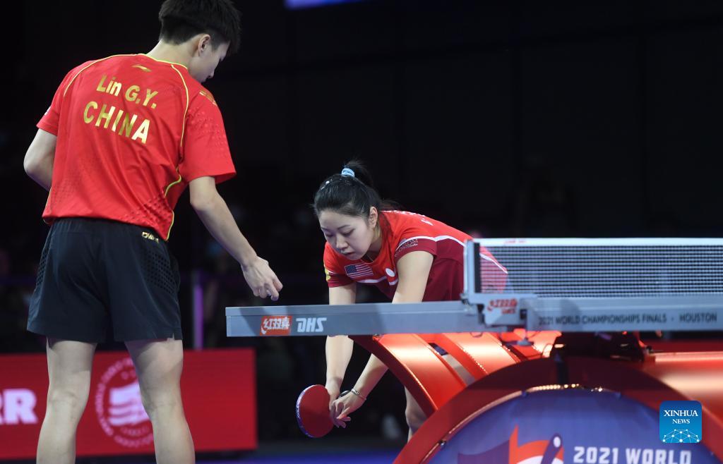 Lin Gaoyuan (L) and Lily Zhang compete during the mixed doubles round of 16 match between Lin Gaoyuan of China/Lily Zhang of the United States and Kirill Skachkov/Olga Vorobeva of RTT at 2021 World Table Tennis Championships Finals in Houston, the United States on Nov. 26, 2021. (Xinhua/Wu Xiaoling)