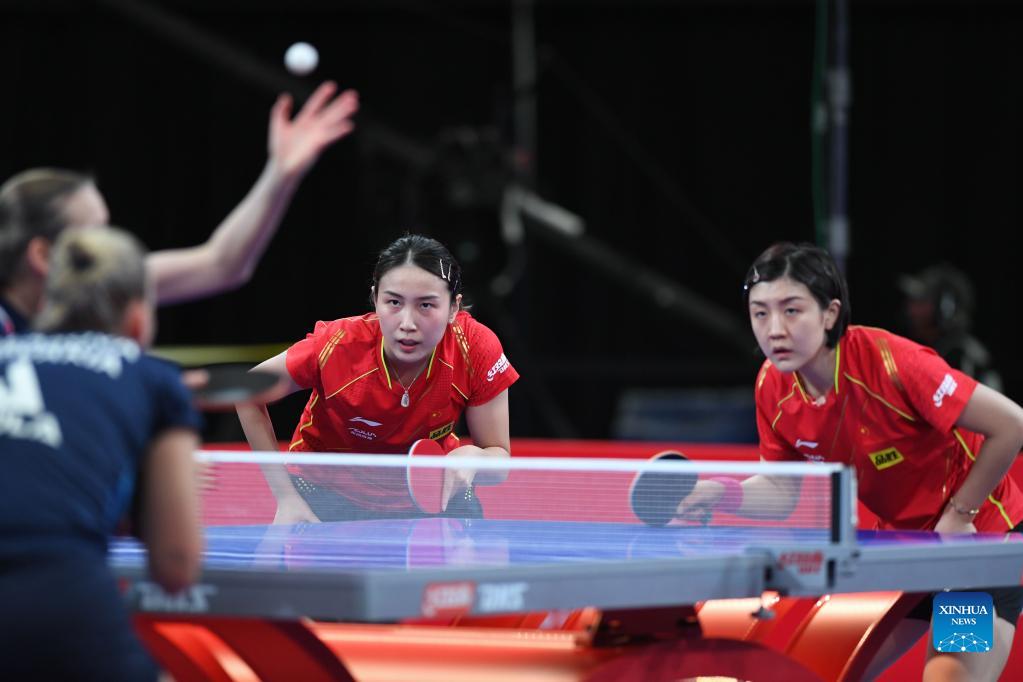Chen Meng (R)/Qian Tianyi of China compete during the women's doubles round of 16 match between Chen Meng/Qian Tianyi of China and Barbora Balazova of Slovakia/Hana Matelova of the Czech Republic at 2021 World Table Tennis Championships Finals in Houston, the United States on Nov. 26, 2021. (Xinhua/Wu Xiaoling)