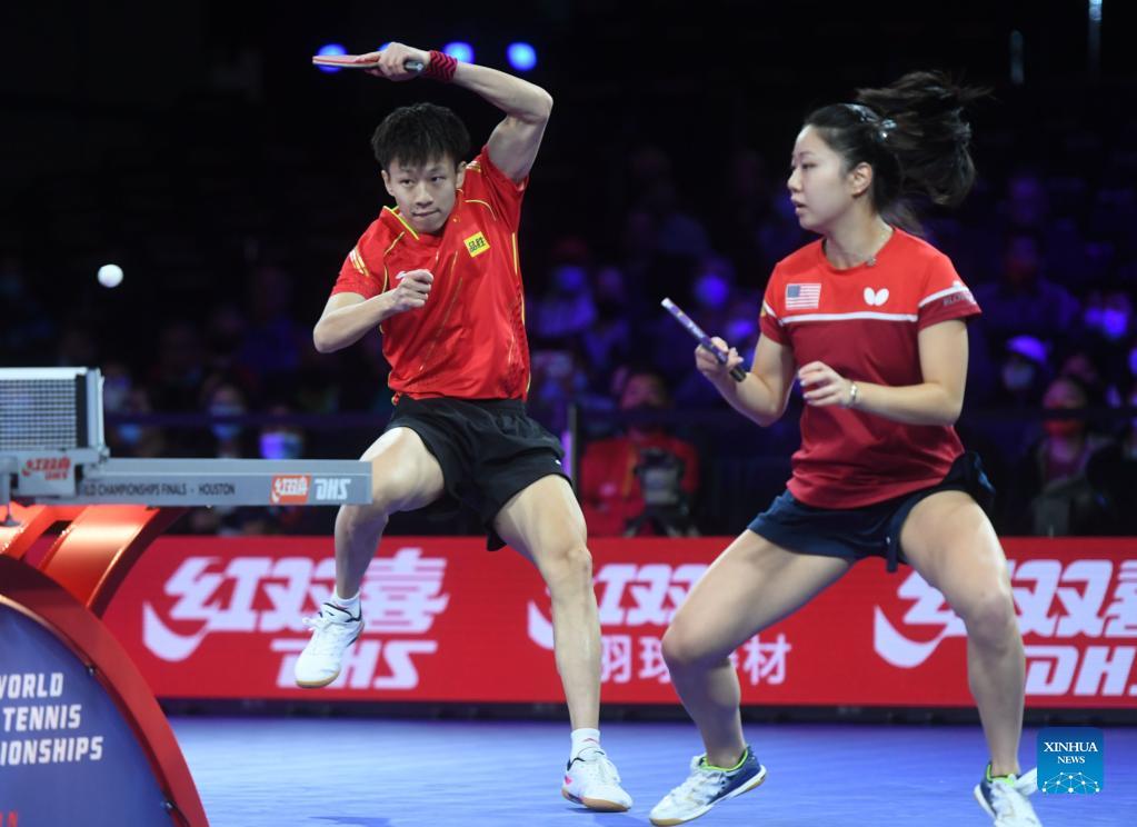 Lin Gaoyuan (L) and Lily Zhang compete during the mixed doubles round of 16 match between Lin Gaoyuan of China/Lily Zhang of the United States and Kirill Skachkov/Olga Vorobeva of RTT at 2021 World Table Tennis Championships Finals in Houston, the United States on Nov. 26, 2021. (Xinhua/Wu Xiaoling)