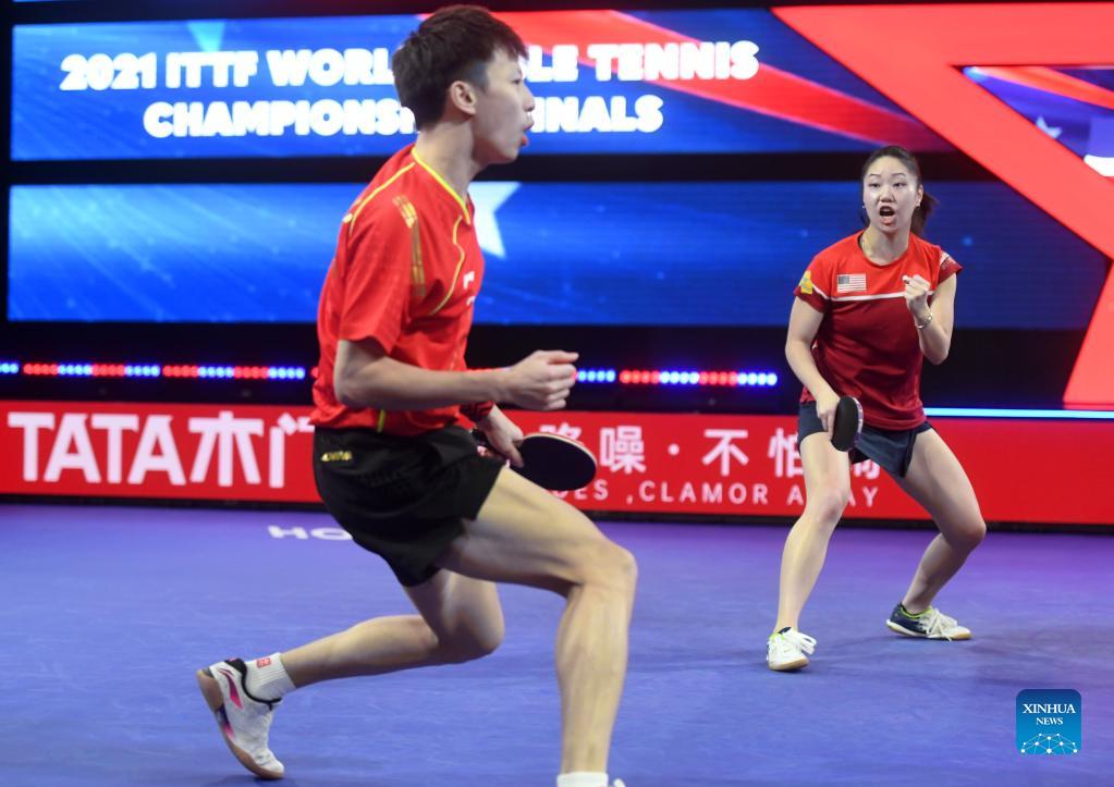 Lin Gaoyuan (L) and Lily Zhang celebrate during the mixed doubles round of 16 match between Lin Gaoyuan of China/Lily Zhang of the United States and Kirill Skachkov/Olga Vorobeva of RTT at 2021 World Table Tennis Championships Finals in Houston, the United States on Nov. 26, 2021. (Xinhua/Wu Xiaoling)