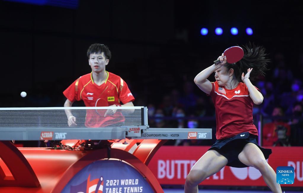 Lin Gaoyuan (L) and Lily Zhang compete during the mixed doubles round of 16 match between Lin Gaoyuan of China/Lily Zhang of the United States and Kirill Skachkov/Olga Vorobeva of RTT at 2021 World Table Tennis Championships Finals in Houston, the United States on Nov. 26, 2021. (Xinhua/Wu Xiaoling)