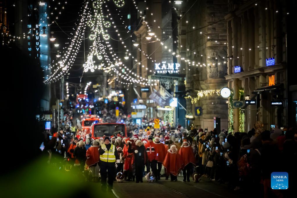 People take part in a parade during a traditional Christmas opening event in Helsinki, Finland, on Nov. 27, 2021. The Christmas opening event was held in central Helsinki on Saturday, marking the start of the festive season. (Photo by Matti Matikainen/Xinhua)