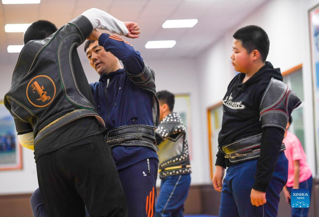 Students learn Mongolian wrestling, or "Boke" in Chinese, during their extra-curricular hours at a middle school in Xilinhot City in north China's Inner Mongolia Autonomous Region, on Nov. 26, 2021. Extra-curricular activities aim to meet the needs of different students and promote their healthy development. (Xinhua/Peng Yuan)