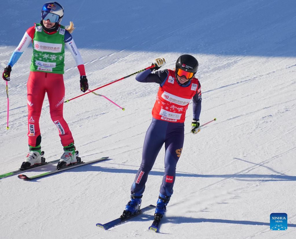 Sweden's Sandra Naeslund (R) celebrates after winning the women's ski cross final at the FIS Ski World Cup in Chongli, north China's Hebei Province, Nov. 27, 2021. (Xinhua/Yang Shiyao)