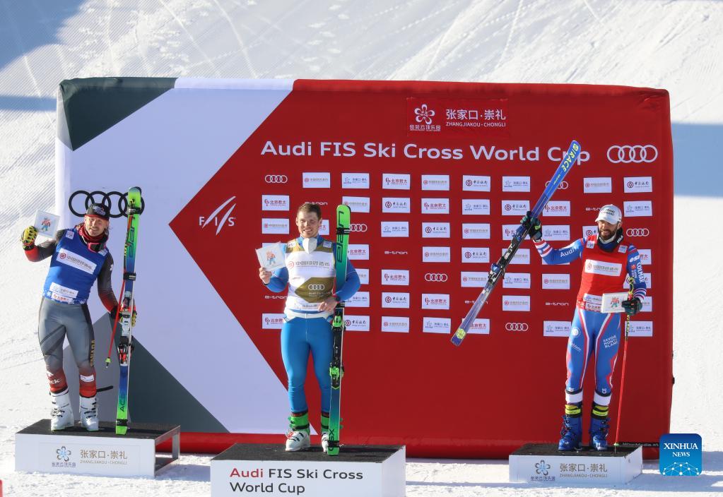 Gold medalist Russia's Sergey Ridzik (C), silver medalist Canada's Brady Leman (L) and bronze medalist France's Bastien Midol pose on the podium during the awarding ceremony for the men's ski cross final at the FIS Ski World Cup in Chongli, north China's Hebei Province, Nov. 27, 2021. (Xinhua/Yang Shiyao)