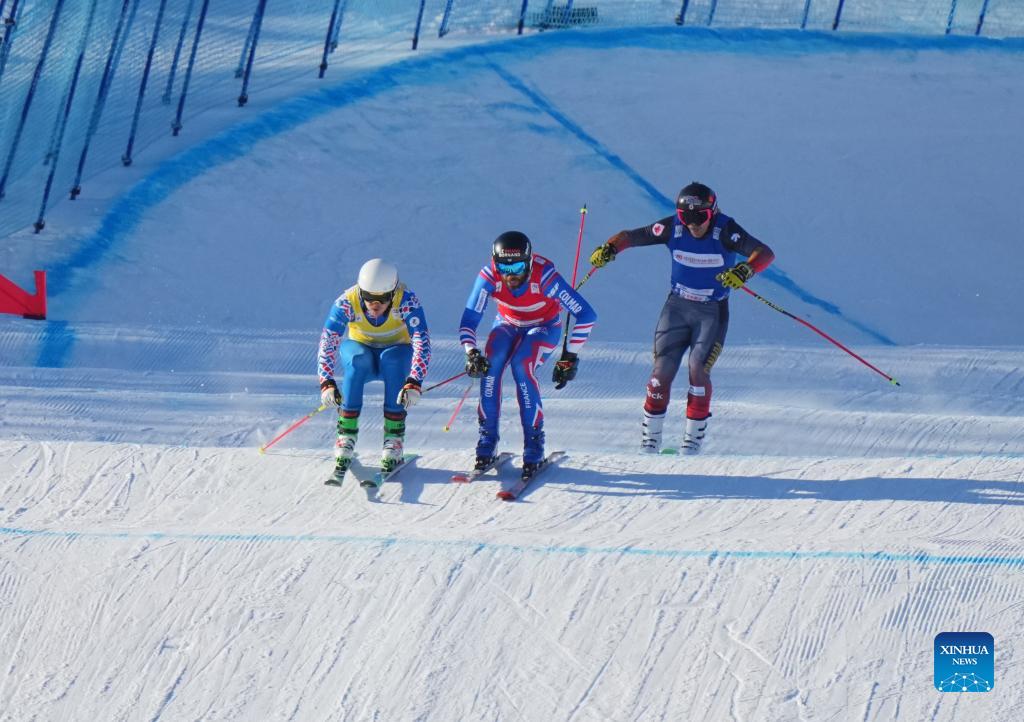 Russia's Sergey Ridzik (L), Canada's Brady Leman (R) and France's Bastien Midol compete during the men's ski cross final at the FIS Ski World Cup in Chongli, north China's Hebei Province, Nov. 27, 2021. (Xinhua/Yang Shiyao)