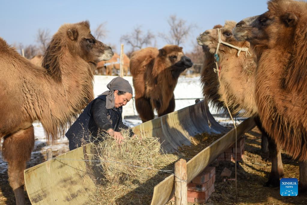 A breeder feeds camels with fodder in Fuhai County of Altay, northwest China's Xinjiang Uygur Autonomous Region, Nov. 25, 2021. Fuhai, located in north Xinjiang, is an important stock farming base in the region, with unique geographical and climatic conditions especially suitable for camel breeding. In recent years, camel breeding has developed into a pillar industry under promotion policy in Fuhai. By establishing camel milk cooperatives, individual herders here are accessing the dairy market through unified and stable sales channels. In 2021, the number of camels in the county has totaled 22,300, among which 6,470 are dairy camels with a daily milk output of 12,500 kilograms. (Xinhua/Ding Lei)