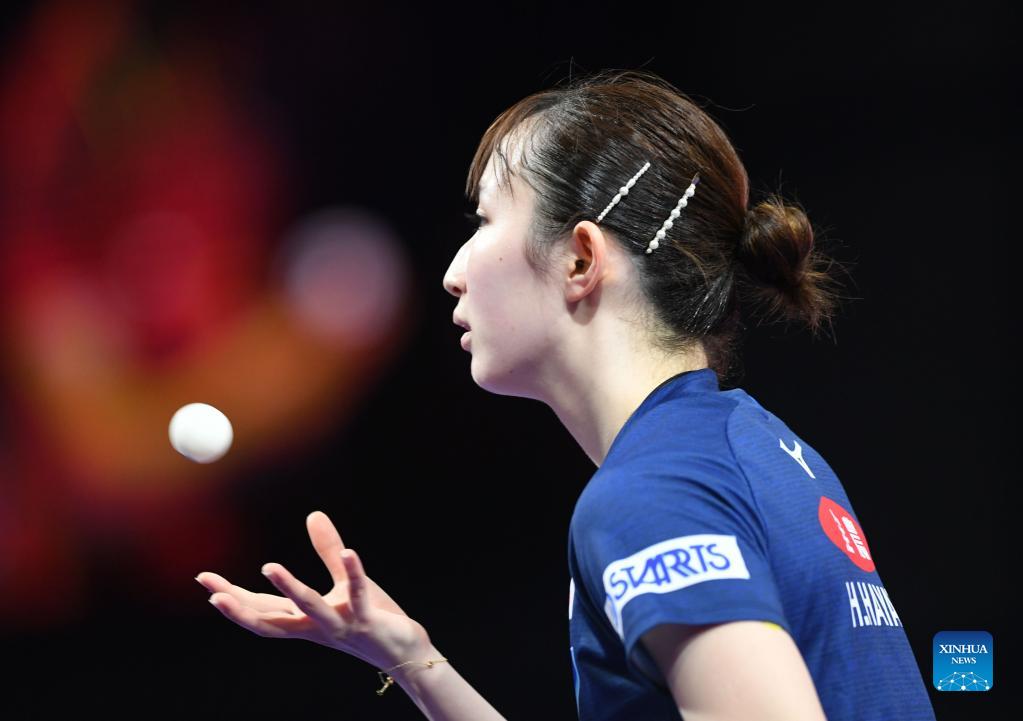 Hayata Hina of Japan competes during the women's singles round of 16 match between Wang Yidi of China and Hayata Hina of Japan at 2021 World Table Tennis Championships Finals in Houston, the United States on Nov. 26, 2021. (Xinhua/Wu Xiaoling)