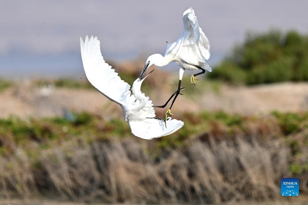 Little egrets fight for food at a beach in Jahra Governorate, Kuwait, Nov. 26, 2021. (Photo by Ghazy Qaffaf/Xinhua)