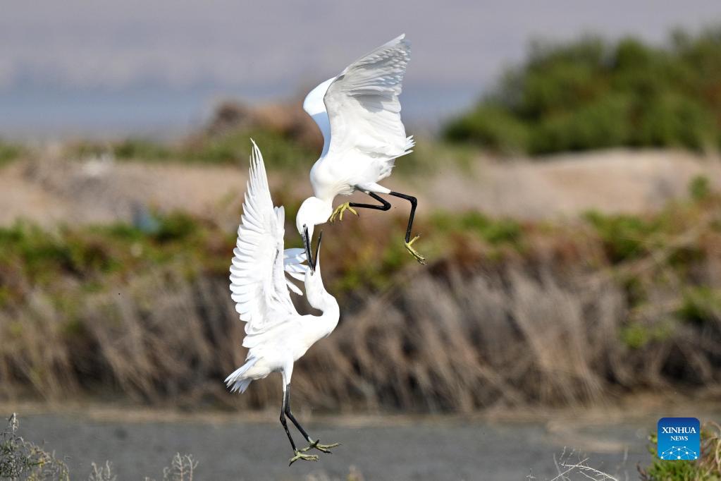 Little egrets fight for food at a beach in Jahra Governorate, Kuwait, Nov. 26, 2021. (Photo by Ghazy Qaffaf/Xinhua)