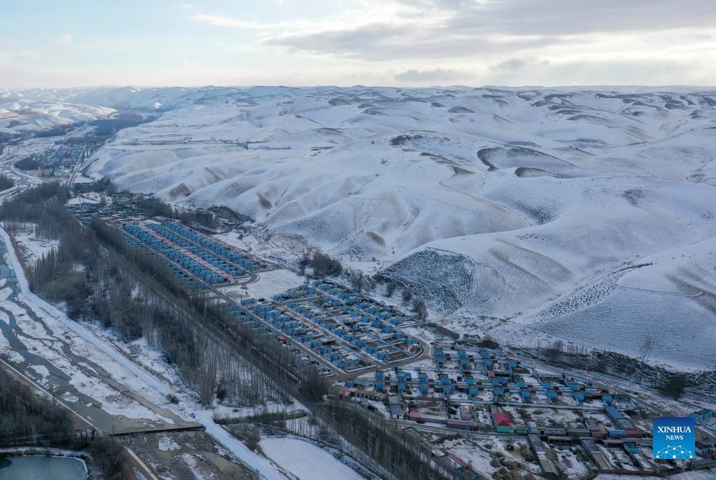 Aerial photo taken on Nov. 27, 2021 shows a herders' settlement in Sarbulak Township, Huocheng County, northwest China's Xinjiang Uygur Autonomous Region. Local herders in Huocheng County are moving their livestock to winter pastures as the weather gets colder. (Xinhua/Zhao Ge)