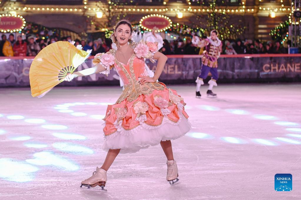 A skater performs during the opening ceremony of the GUM ice rink on the Red Square in Moscow, Russia, on Nov. 28, 2021. (Xinhua/Evgeny Sinitsyn)