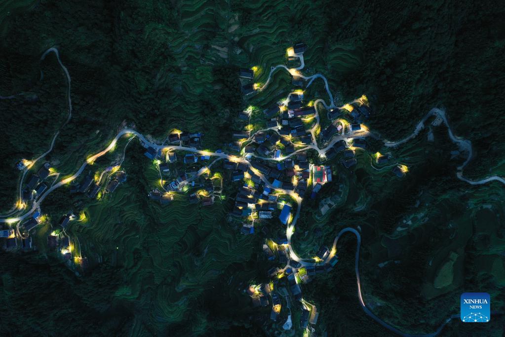 Aerial photo taken on Aug. 31, 2021 shows the night view of Dangjiu Village in Gandong Township of Rongshui Miao Autonomous County, south China's Guangxi Zhuang Autonomous Region. More and more solar powered street lamps have been erected in areas tucked away in the mountains in Guangxi, illuminating the night sky for people living there. (Xinhua/Huang Xiaobang)
