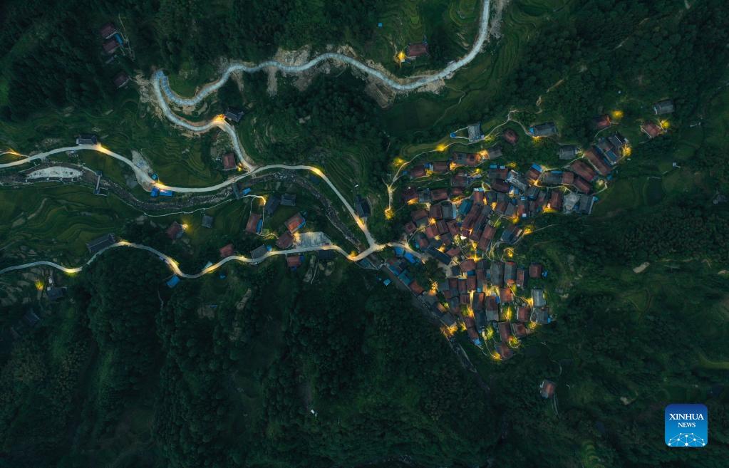 Aerial photo taken on Aug. 25, 2021 shows the night view of Dangjiu Village in Gandong Township of Rongshui Miao Autonomous County, south China's Guangxi Zhuang Autonomous Region. More and more solar powered street lamps have been erected in areas tucked away in the mountains in Guangxi, illuminating the night sky for people living there. (Xinhua/Huang Xiaobang)
