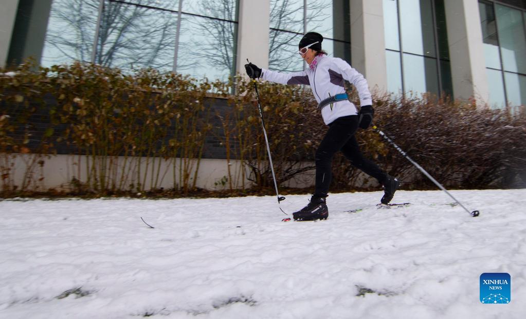 A woman skis on a street during a snowy day in Toronto, Ontario, Canada, on Nov. 28, 2021. A snowfall hit much of southern Ontario on Sunday. (Photo by Zou Zheng/Xinhua)