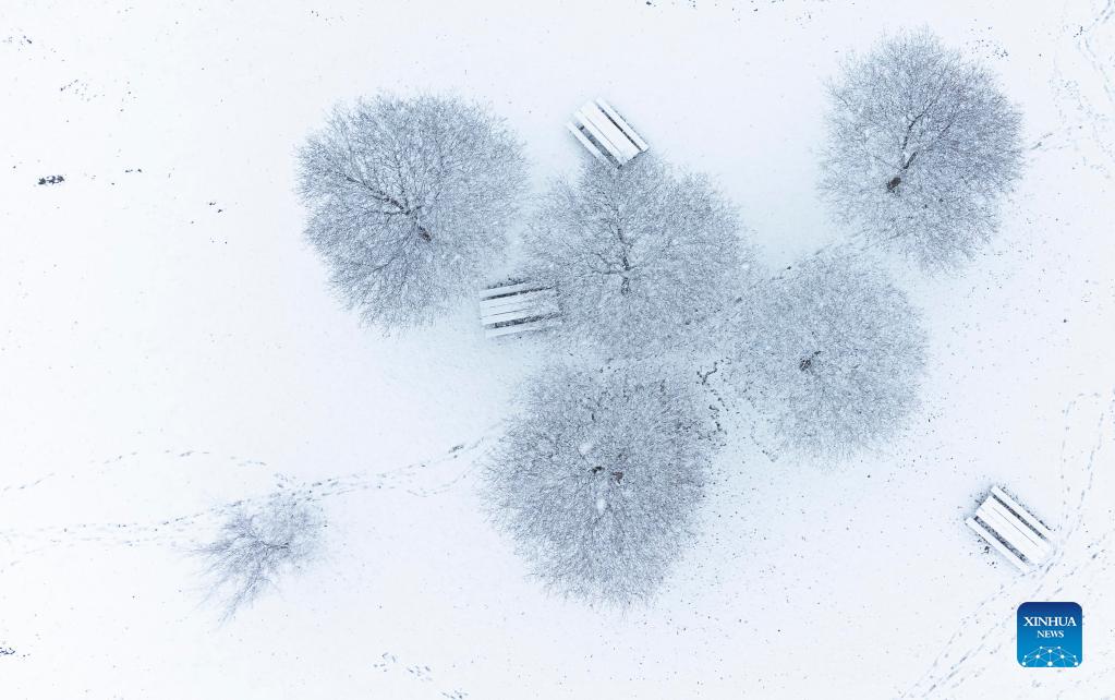 Aerial photo taken on Nov. 28, 2021 shows the snow scenery in a park in Hamilton, Ontario, Canada. A snowfall hit much of southern Ontario on Sunday. (Photo by Zou Zheng/Xinhua)